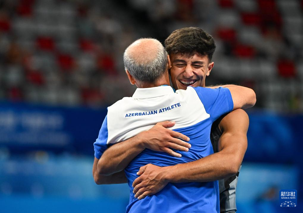 8月10日,亚军阿塞拜疆选手托菲格·阿利耶夫(右)在比赛后庆祝。