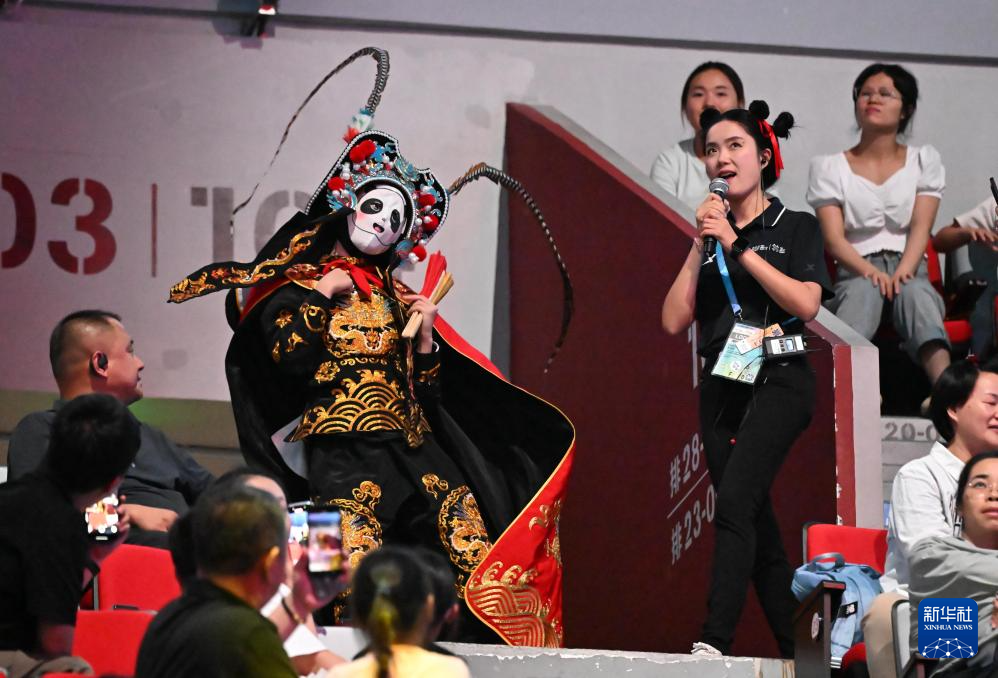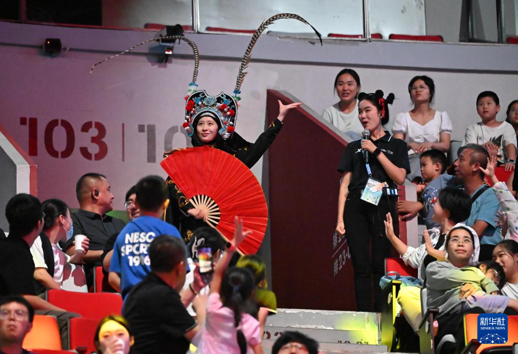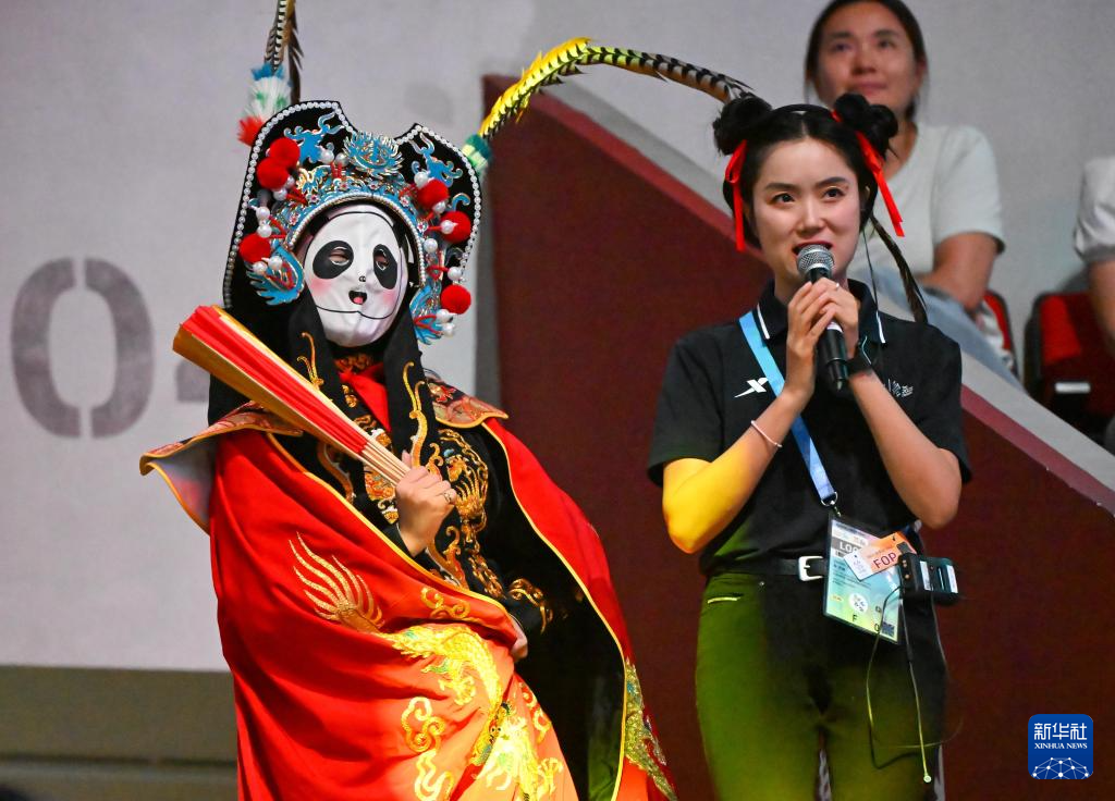 当日,在2025年成都世运会技巧和蹦床比赛前,川剧变脸表演者进行暖场表演。