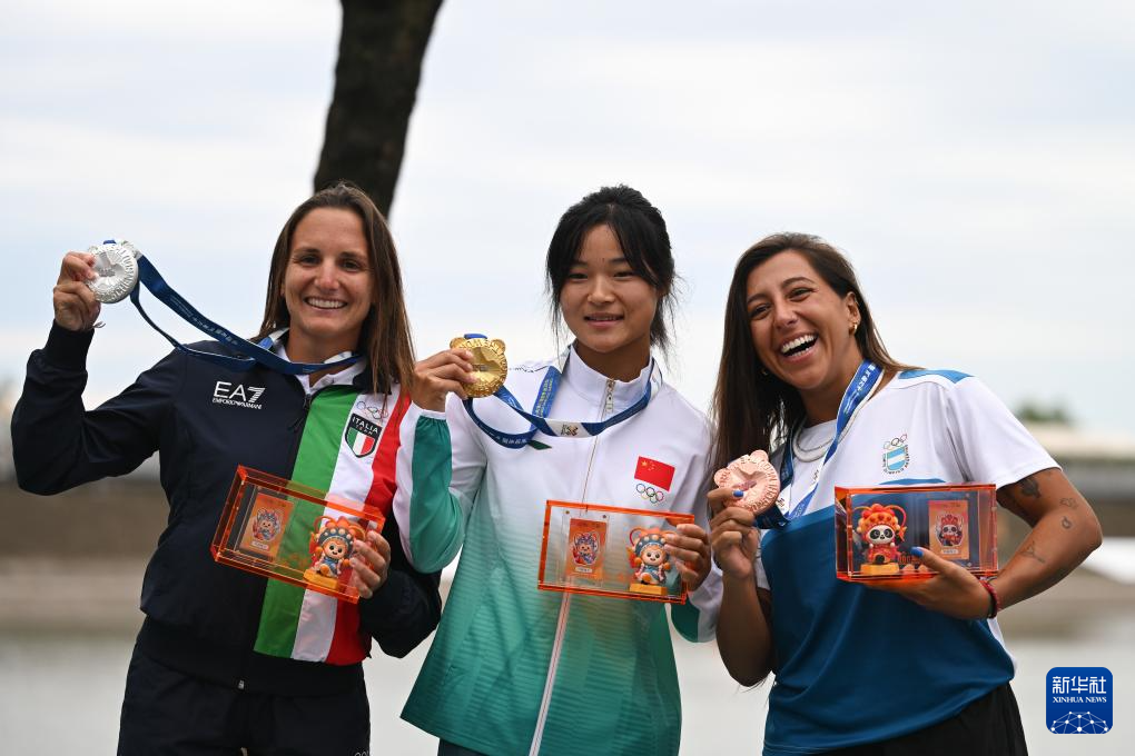 8月10日,冠军中国选手徐露(中)、亚军意大利选手维拉格(左)、季军阿根廷选手德阿马斯在颁奖仪式上。