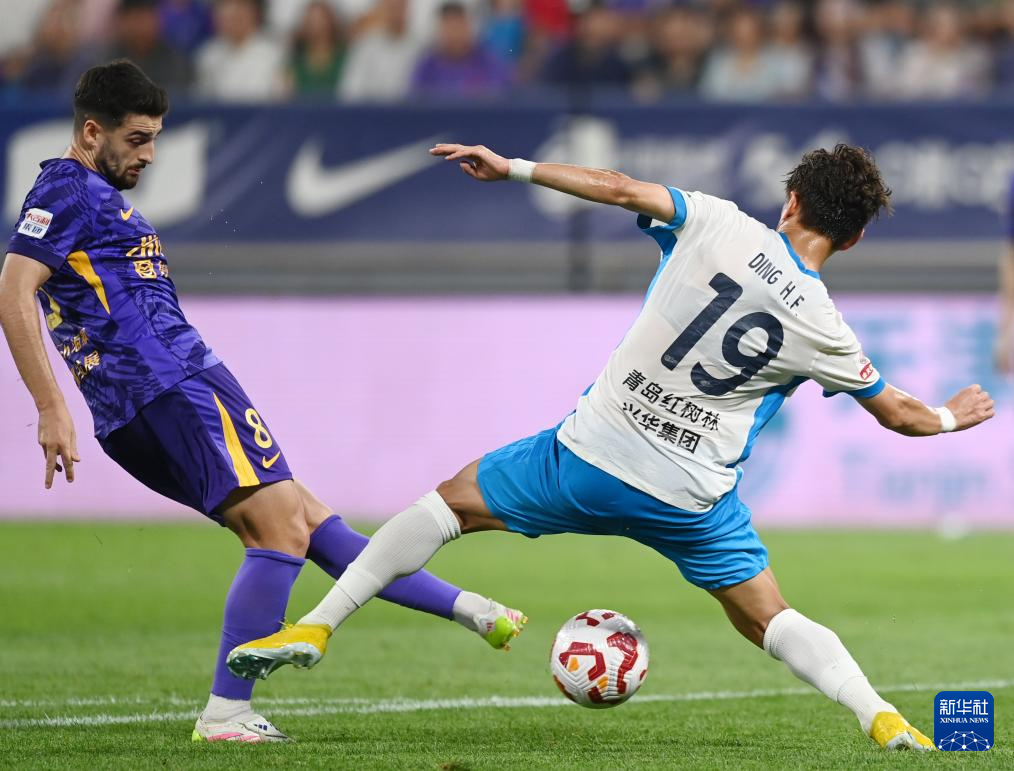 8月10日,青岛西海岸队球员内尔松·卢斯(左)在比赛中传球。