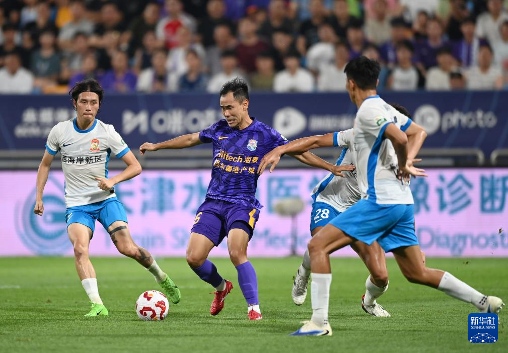 8月10日,青岛西海岸队球员王鹏(左)和天津津门虎队球员阿代米在比赛中拼抢。