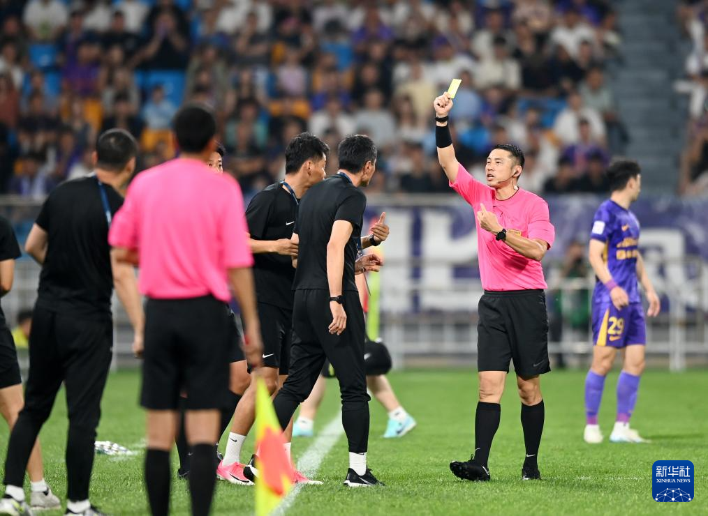 8月10日,主裁判黄翼(右二)向青岛西海岸队主教练邵佳一(右三)出示黄牌。