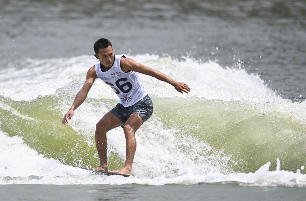 来自广东的庄天才是4年多前在海南三亚接触到尾波冲浪这个项目的。他说:“尾波冲浪在国内属于新兴项目,2021年算是刚刚起步,当时整体的训练水平还不高,也缺少很专业的教练,我最开始练的时候是靠下载一些外国选手的比赛视频,自己一帧一帧地去看,去学习模仿别人的动作。”