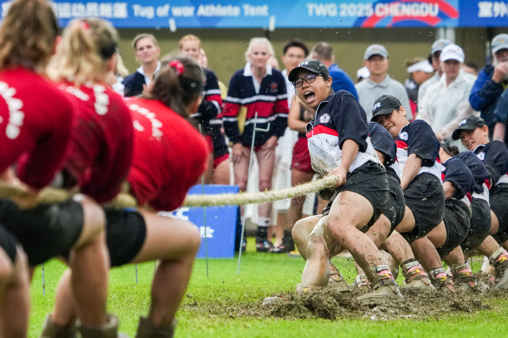 世运会女子拔河项目只设一个小项。当天上午,大雨天气给比赛带来不小的挑战,原定于10时进行的比赛延后了半小时。尽管如此,参赛队员们斗志不减。