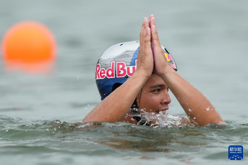 8月10日,菲律宾选手特立尼达(右)庆祝法国选手德绍获得冠军。