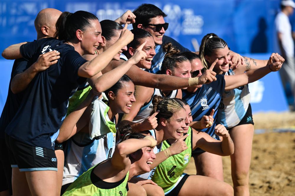 8月12日,沙滩手球女子决赛阿根廷队战胜德国队夺冠后,阿根廷队员在庆祝。新华社记者 陈振海 摄
