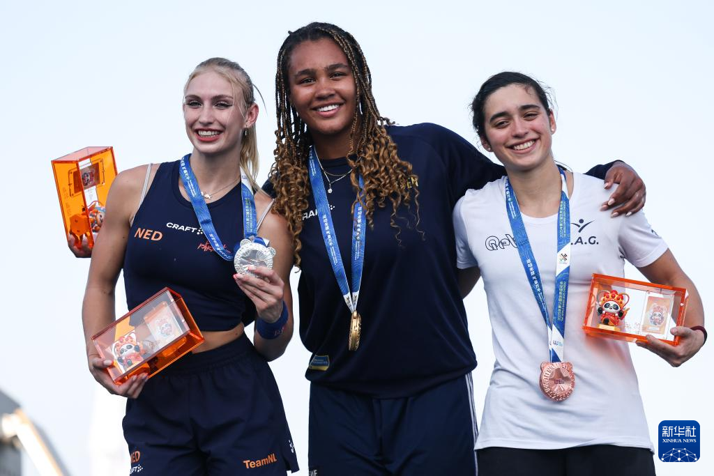8月12日,冠军瑞典选手米兰达(中)、亚军荷兰选手曼(左)、季军阿根廷选手莎拉在颁奖仪式上。