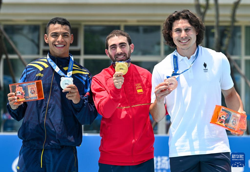 8月12日,亚军哥伦比亚队选手塔斯孔、冠军西班牙队选手古斯曼和季军法国队选手伊万(从左至右)在颁奖仪式上展示奖牌。