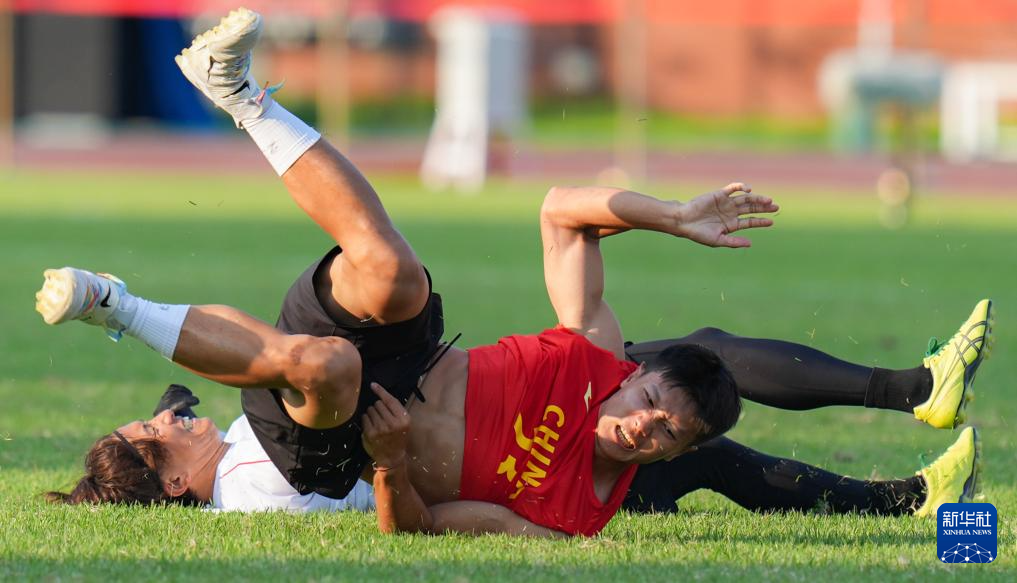 8月13日,中国队选手郭嘉荣(上)在比赛中防守。