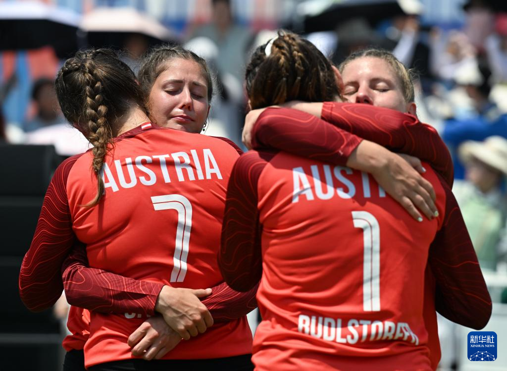 8月13日,奥地利队球员在比赛结束后互相拥抱安慰。