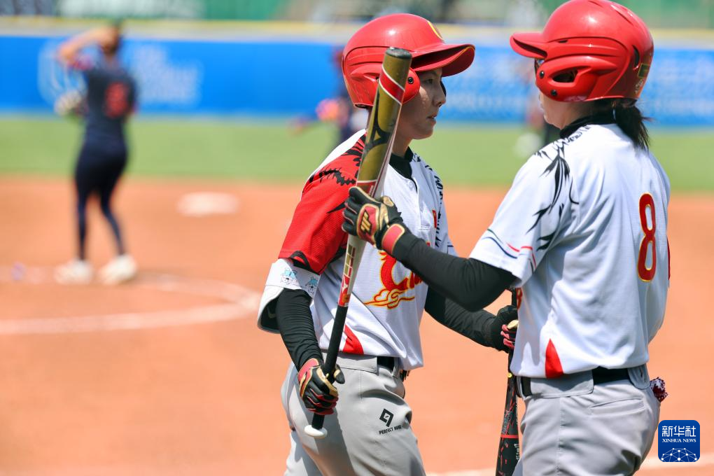8月13日,中国队球员李嘉麒(右)与队友王蓓在比赛中交换垒球棒。