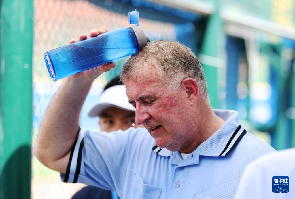 8月13日,一名裁判员在比赛间隙用冰水消暑。