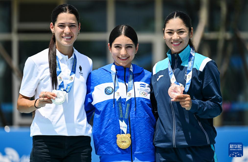 8月13日,冠军萨尔瓦多队选手加利亚多(中)、亚军法国队选手布吕内(左)、季军危地马拉队选手达利娅在颁奖仪式上。
