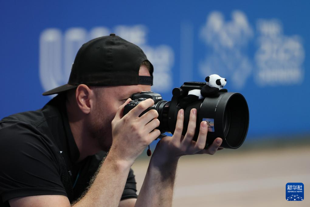 8月13日,比赛现场一名记者在镜头上装饰了熊猫玩偶。