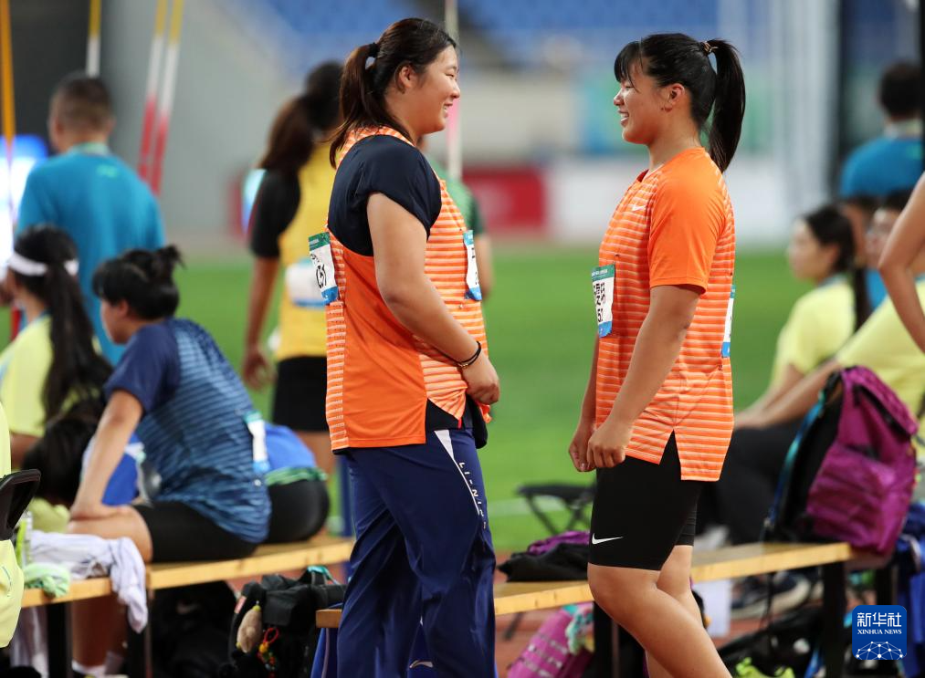 8月13日,浙江队选手严子怡(左)和杨雯玥(右)在女子标枪团体决赛中。最终,浙江队获得第一名。