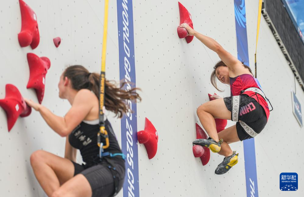 当日,在2025年成都世运会攀岩女子速度个人资格赛中,中国选手周娅菲、覃于妹、邓丽娟、张少琴晋级1/8淘汰赛。