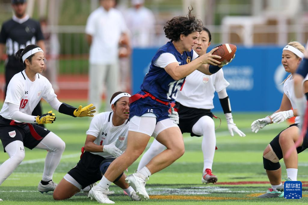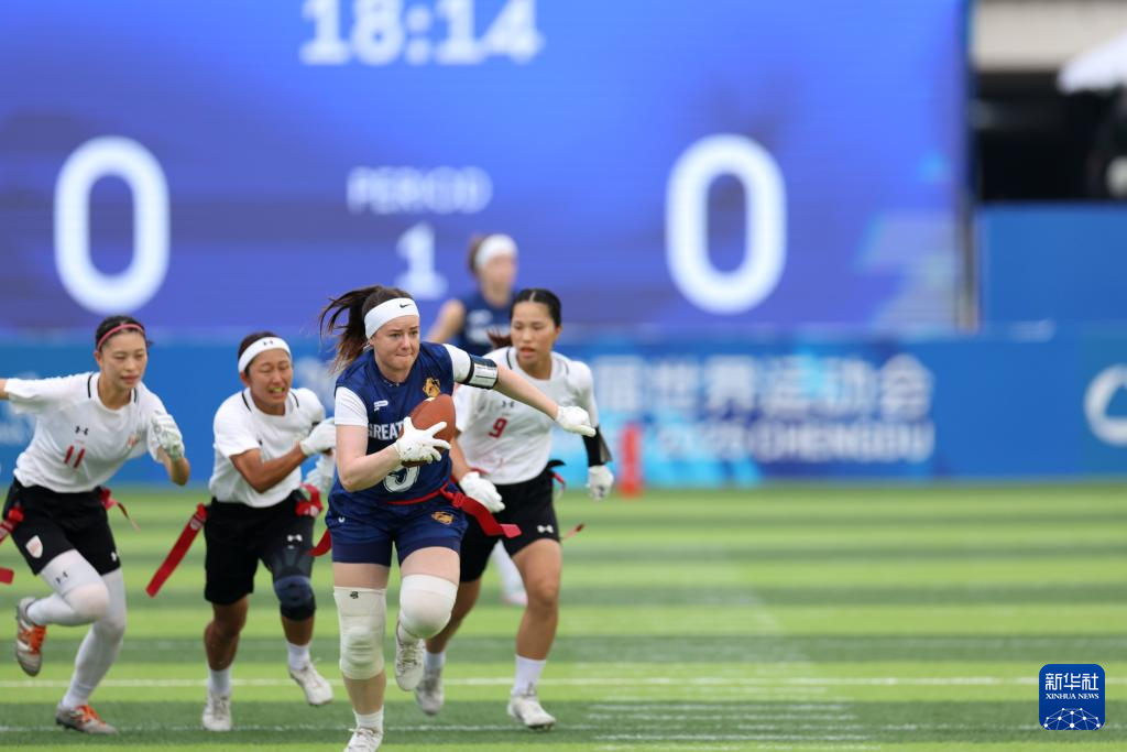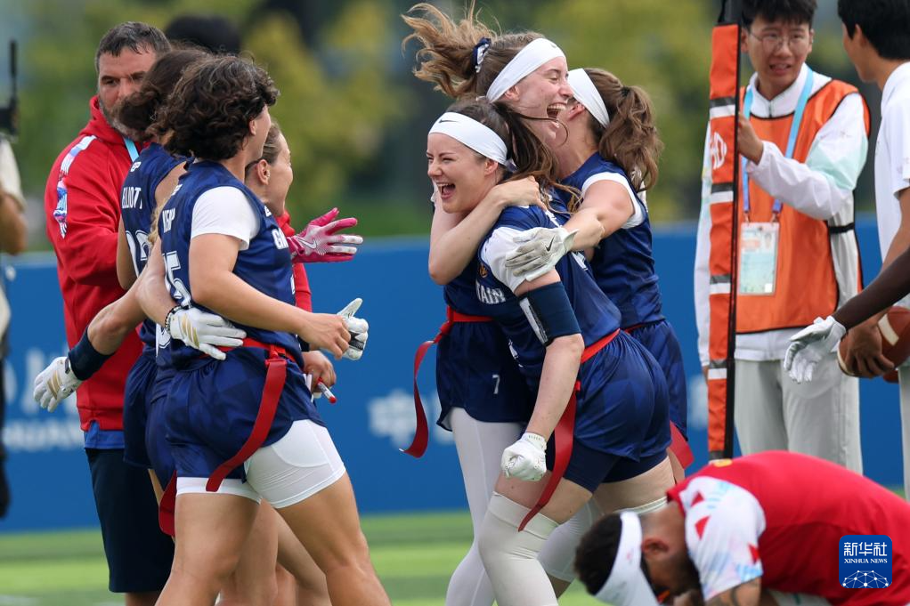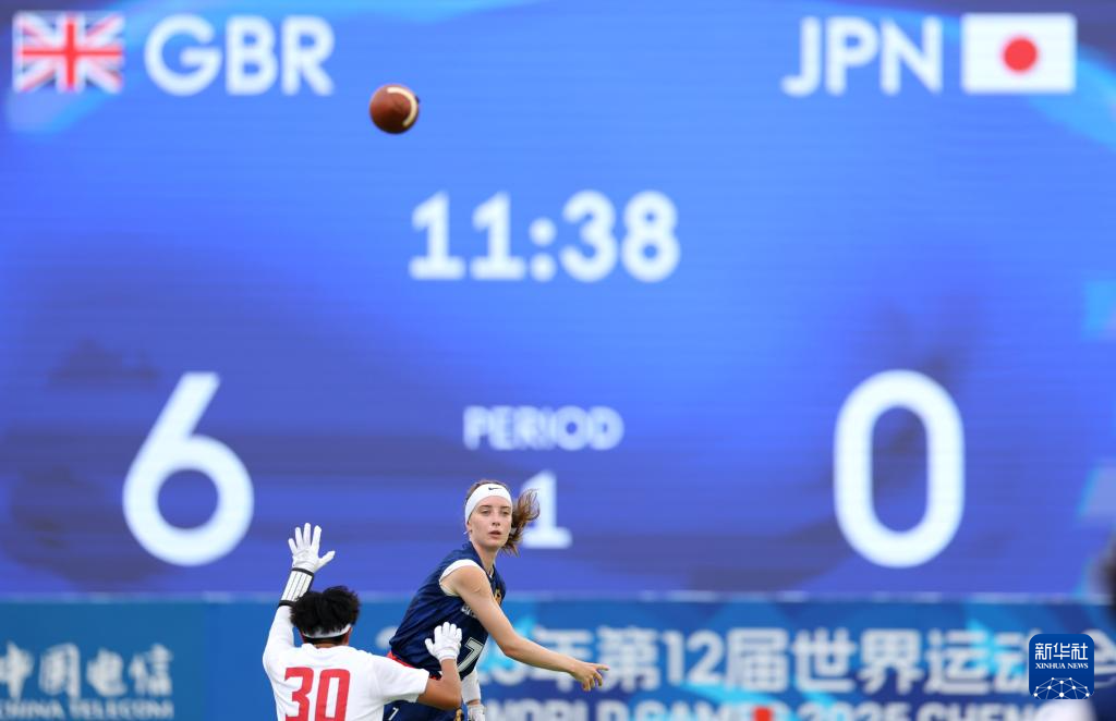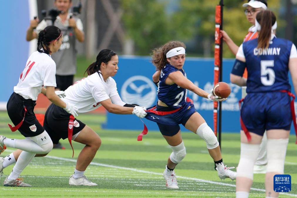 当日,在成都七中东部学校田径场举行的2025年成都世运会腰旗橄榄球女子B组预赛中,英国队26比24战胜日本队。