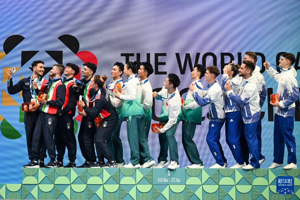8月15日,冠军中国队(中)、亚军意大利队(左)和季军罗马尼亚队(右)在颁奖仪式上自拍留念。