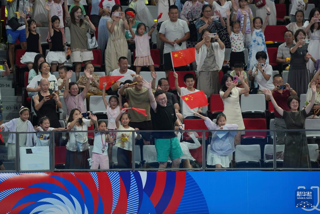 8月15日,观众在场边为中国队庆祝。