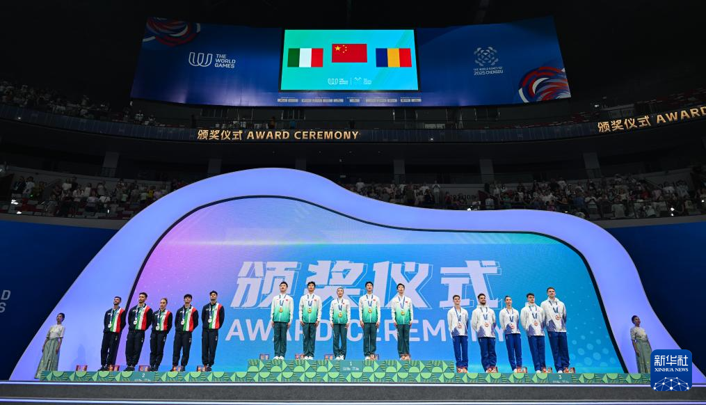8月15日,冠军中国队(中)、亚军意大利队(左)和季军罗马尼亚队(右)在颁奖仪式上。