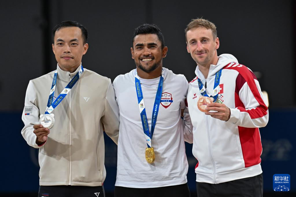 8月14日,巴拉圭选手米雷娜·奥尔蒂斯(中)、中国台北选手赵祖政(左)、瑞士选手温格在颁奖仪式上。