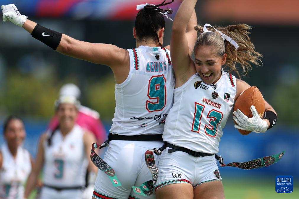 8月15日,墨西哥队球员马丁内斯(右)和队友孔苏埃拉在比赛中庆祝达阵得分。