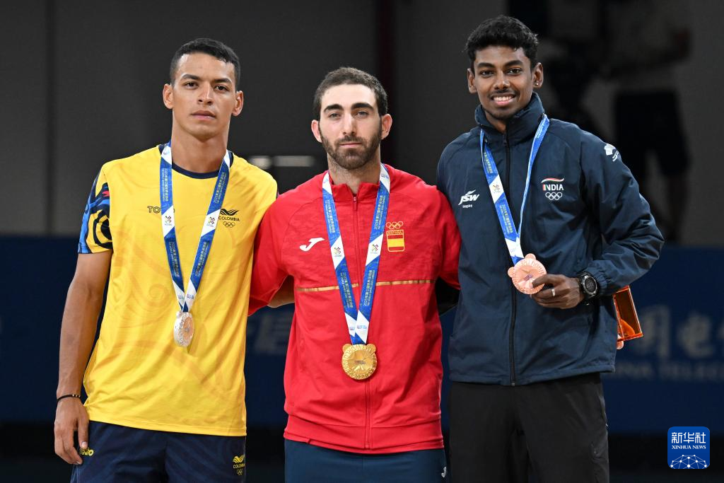 8月15日,亚军哥伦比亚选手塔斯孔·奥尔古因、冠军西班牙选手古斯曼·比塔尔和季军印度选手韦尔库马尔(从左至右)在颁奖仪式上。