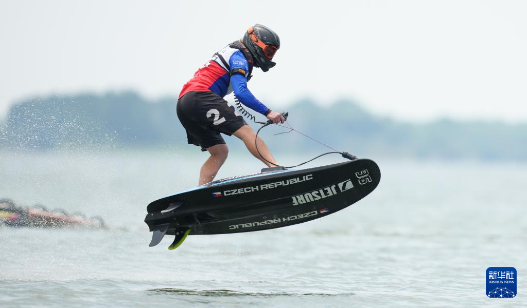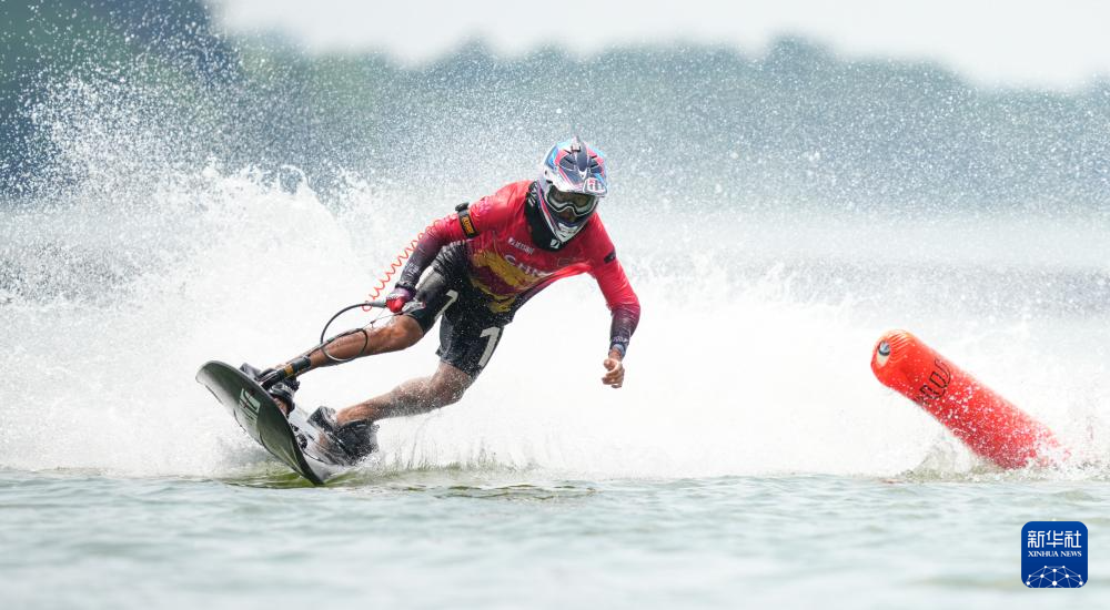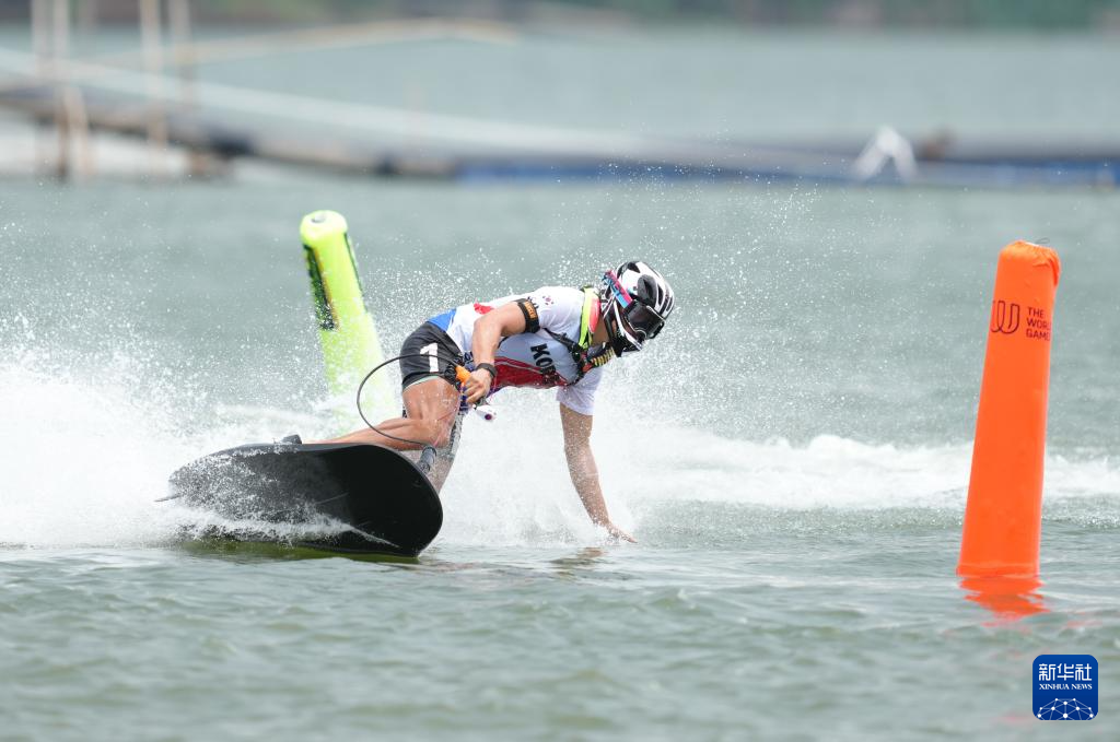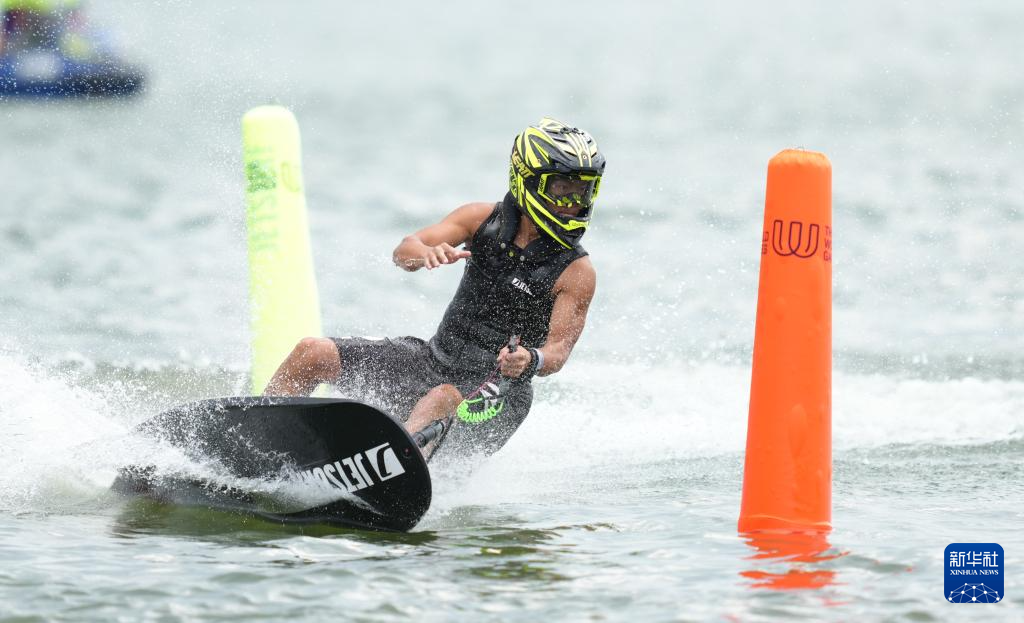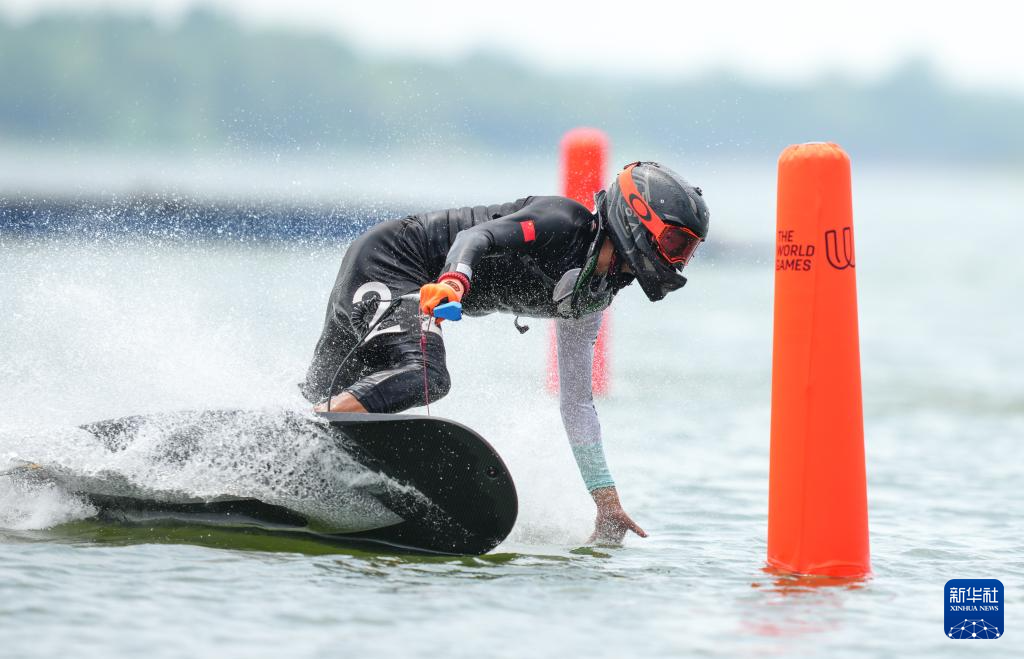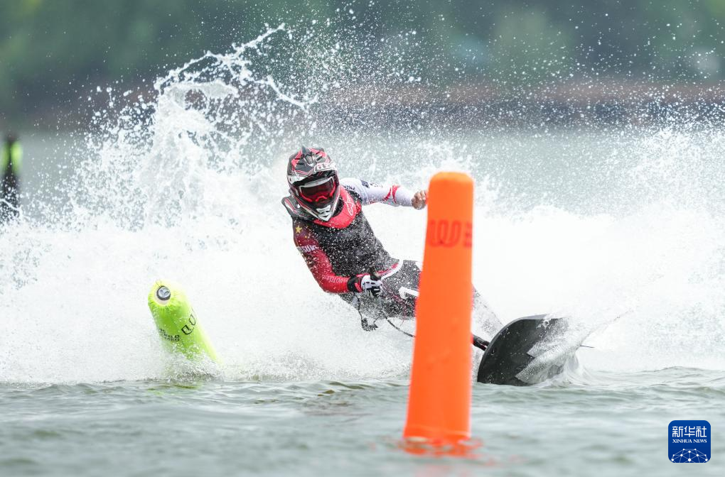 当日,2025年成都世运会摩托艇男子动力冲浪板资格赛在成都三岔湖马鞍山赛场举行。