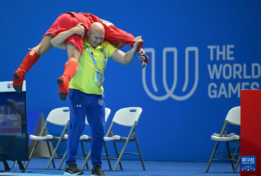 8月14日,乌克兰选手亚历山大(上)和教练在赛后庆祝。