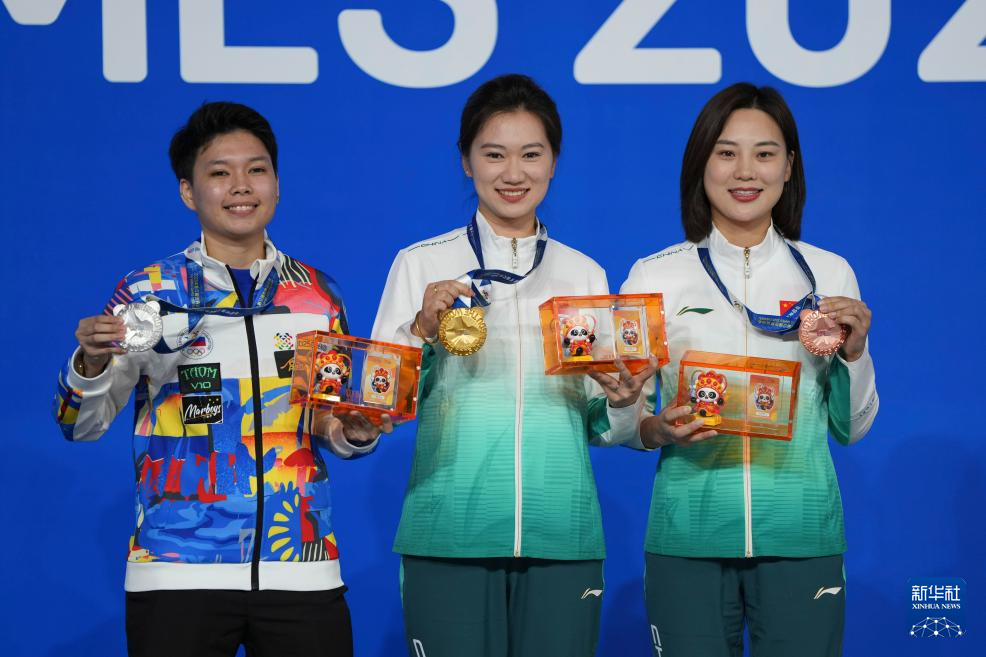 8月14日,台球女子斯诺克6红球冠军中国选手白雨露(中)、亚军泰国选手蓬佩尔(左)和季军泰国选手博雷冲布在颁奖仪式上合影。