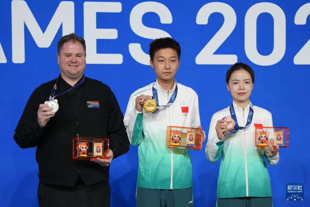 8月14日,台球八球混合冠军中国选手张泰艺(中)、亚军南非选手塞龙(左)和季军中国选手唐春晓在颁奖仪式上合影。