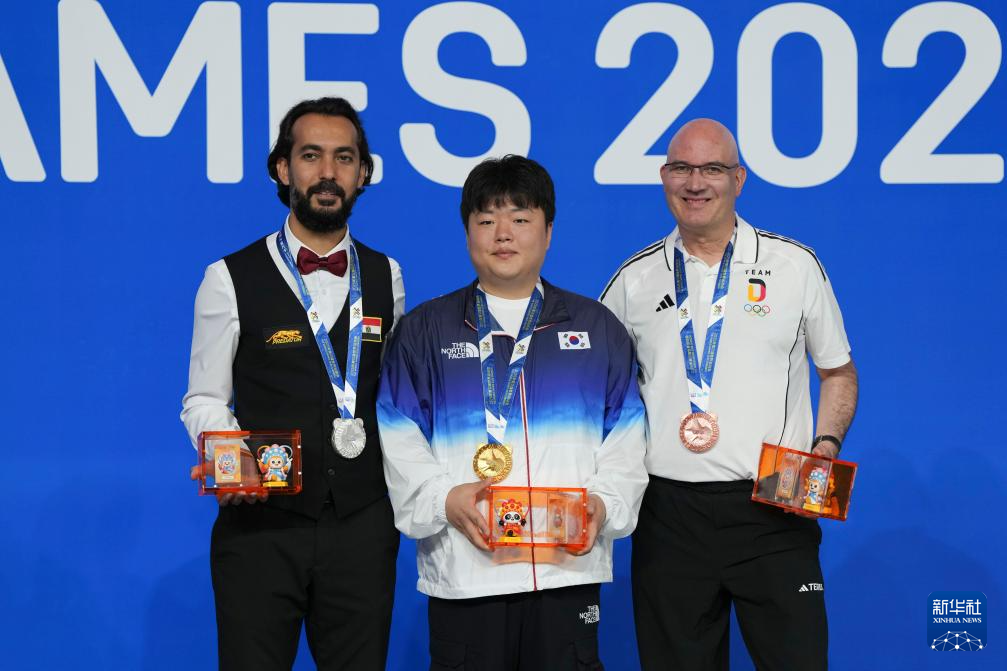 8月14日,台球男子三库开伦冠军韩国选手乔名武(中)、亚军埃及选手西杜姆(左)和季军德国选手霍恩在颁奖仪式上合影。