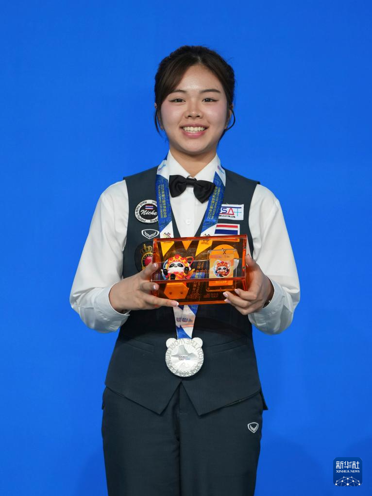 8月14日,台球女子斯诺克6红球亚军泰国选手蓬佩尔在颁奖仪式上。