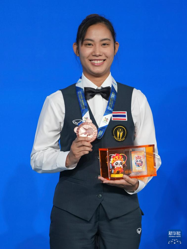 8月14日,台球女子斯诺克6红球季军泰国选手博雷冲布在颁奖仪式上。