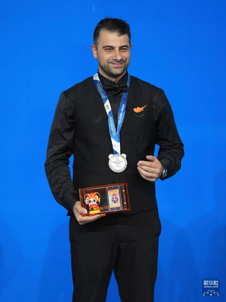 8月14日,台球男子斯诺克亚军塞浦路斯选手乔治乌在颁奖仪式上。