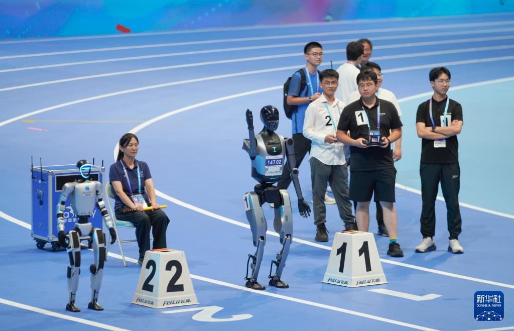 8月14日,工作人员操控机器人在开幕式上开展100米赛跑。