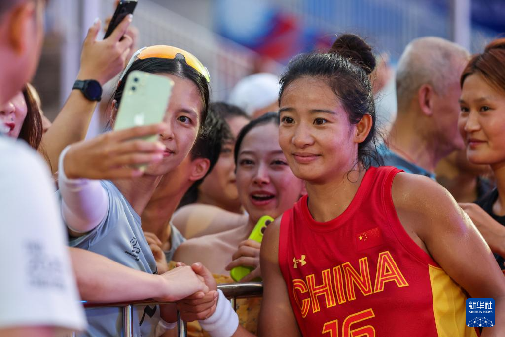 8月16日,中国队球员王欣(前右)在比赛结束后与观众合影。