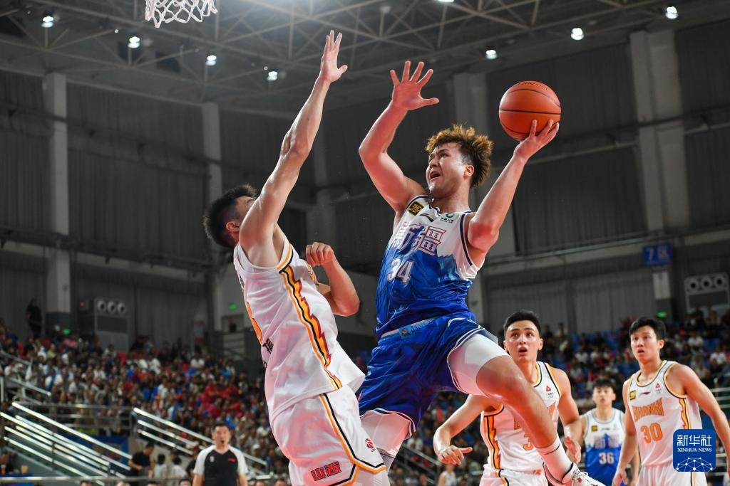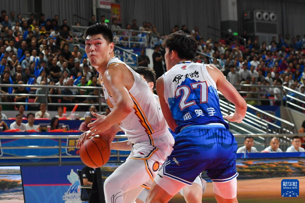 8月15日,新疆伊力特队球员葛浩然(左一)在比赛中持球进攻。