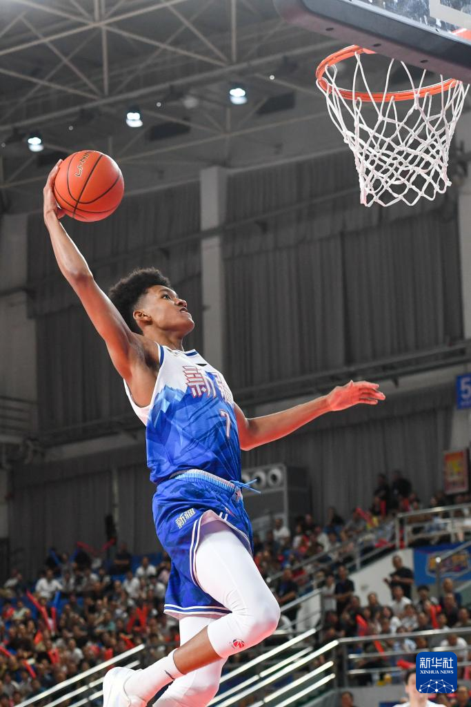 8月15日,新疆伊力特队球员冯傲在比赛中扣篮。