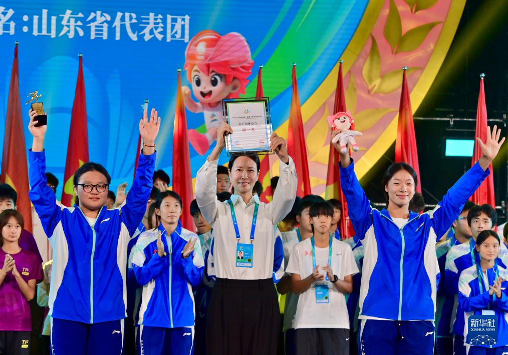 8月15日,获得男子团体项目总分第一名的山东省体育代表团在闭幕式上展示证书。