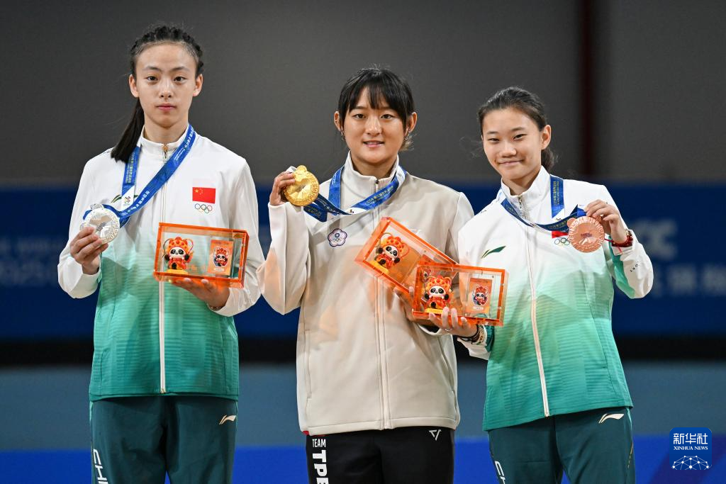 8月16日,亚军中国选手朱思怡、冠军中国台北选手刘巧兮、季军中国选手温晶晶(从左至右)在颁奖仪式上。