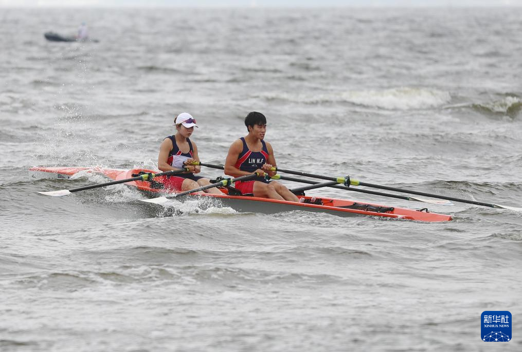 8月15日,福建队选手苏诗雅(右)/林伟锋在成年组混合双人双桨计时赛比赛中。最终,他们以2分53秒93的成绩晋级四分之一决赛。