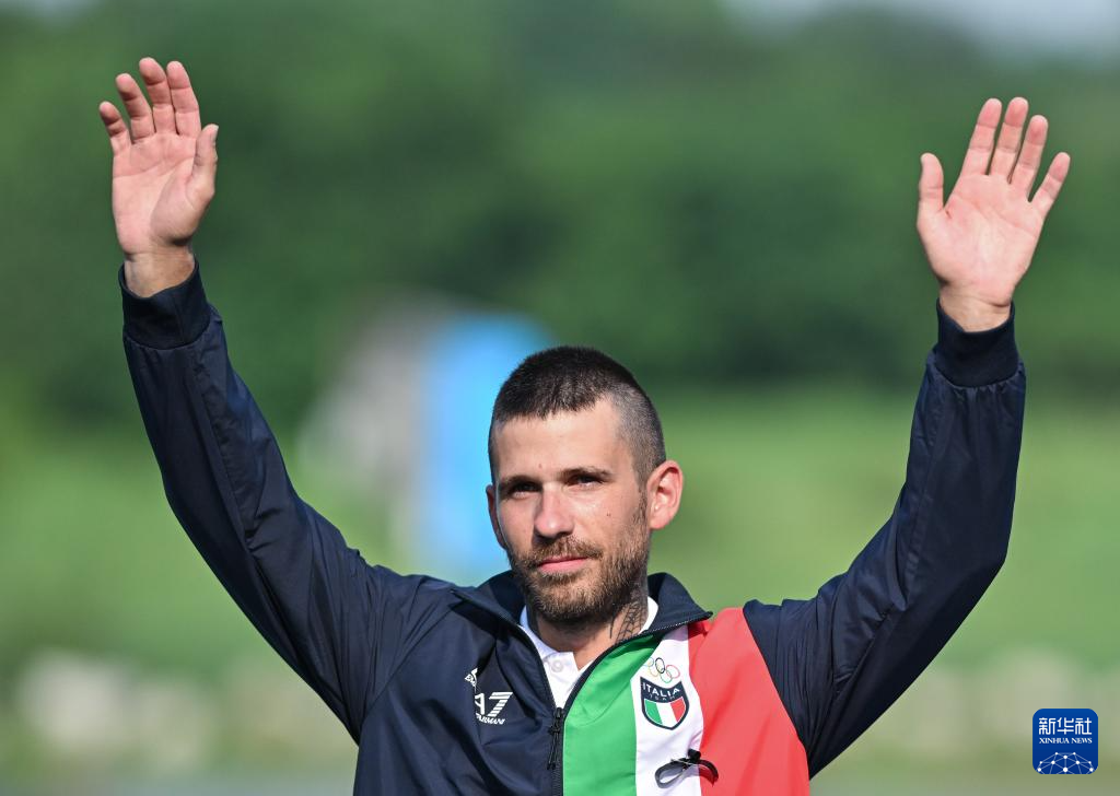 8月16日,冠军意大利选手巴尔别里在颁奖仪式上向观众致意。