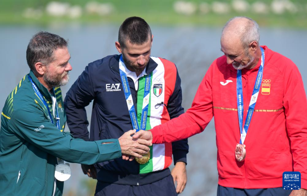 8月16日,冠军意大利选手巴尔别里(左)与季军西班牙选手贝拉在颁奖仪式上握手。