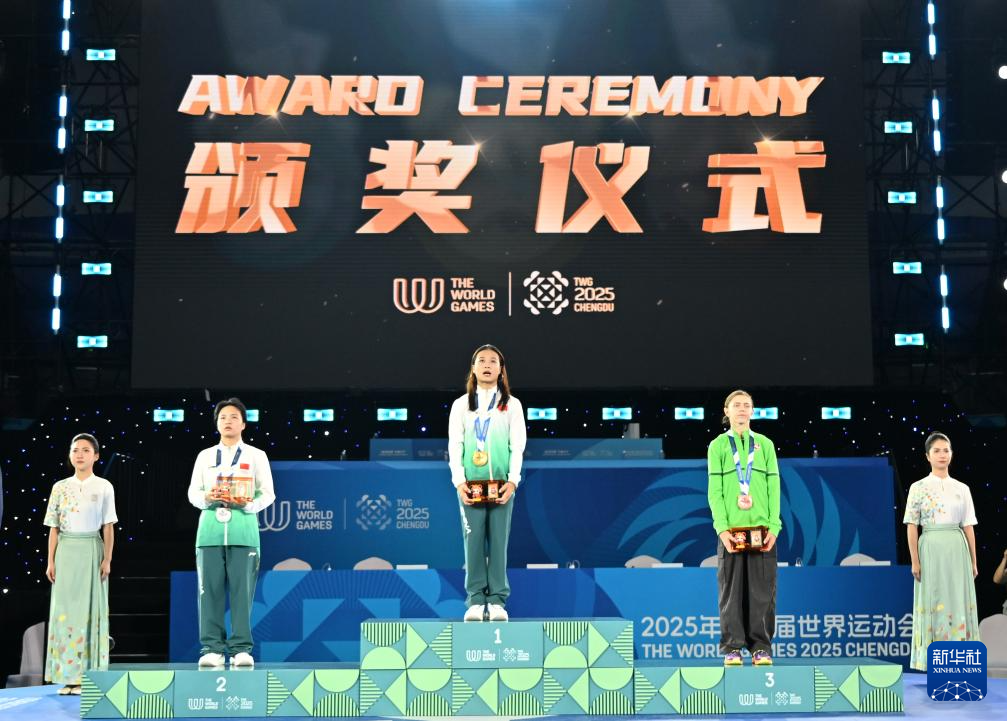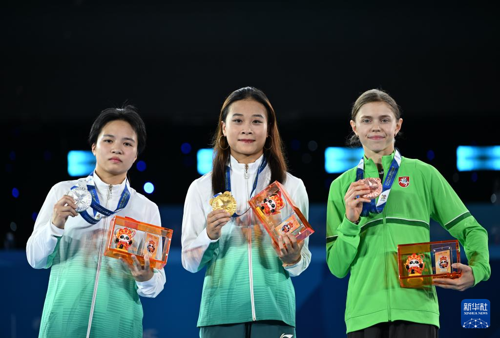8月17日,亚军中国选手刘清漪、冠军中国选手郭朴和季军立陶宛选手妮卡(从左至右)在颁奖仪式上。