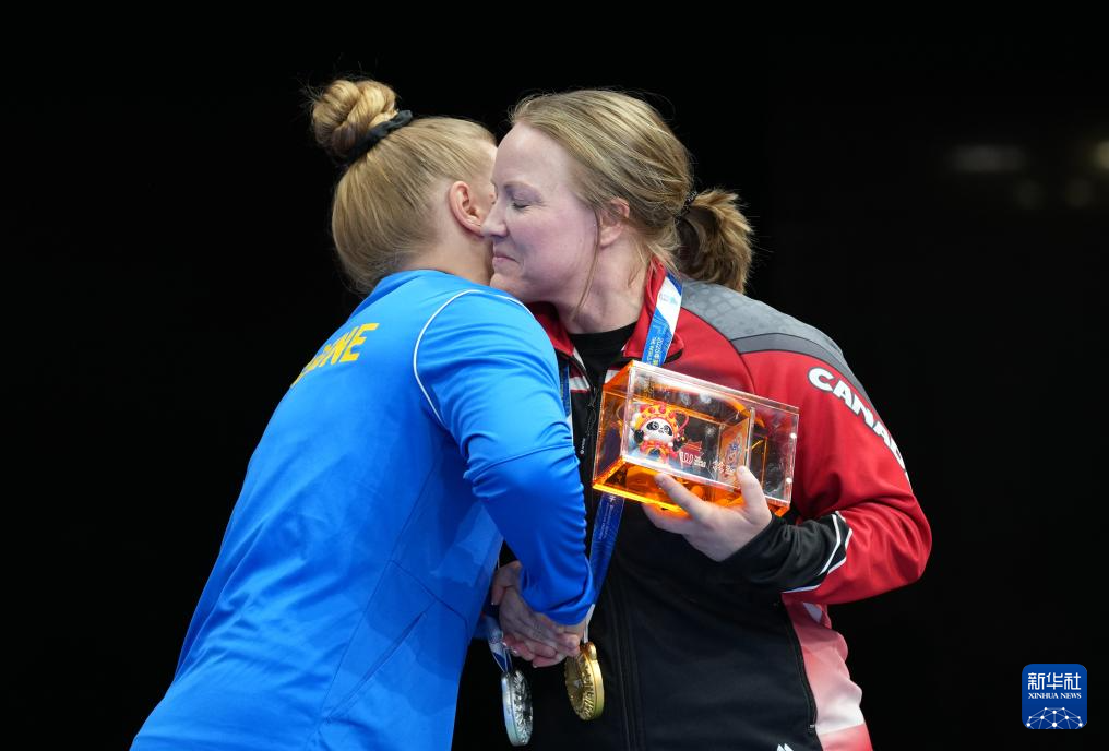 8月17日,冠军加拿大选手施廷(右)与亚军乌克兰选手达里娅在颁奖仪式上拥抱。