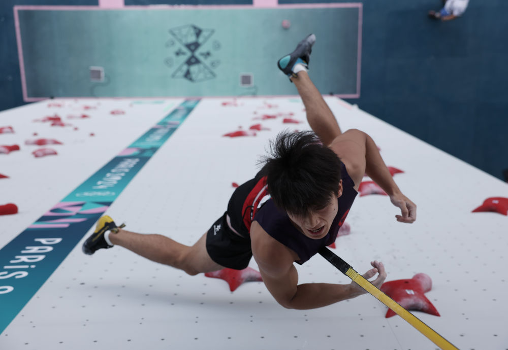 2024年8月8日,中国选手伍鹏在巴黎奥运会攀岩男子速度赛比赛中。