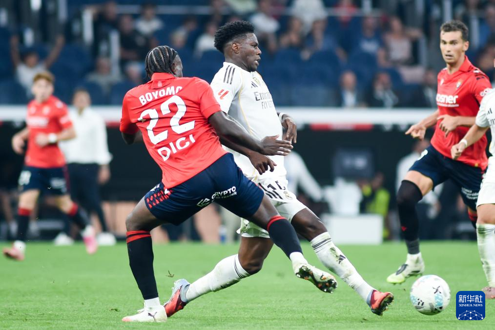 8月19日,皇家马德里队球员楚阿梅尼(右)和奥萨苏纳球员奥罗斯在比赛中拼抢。