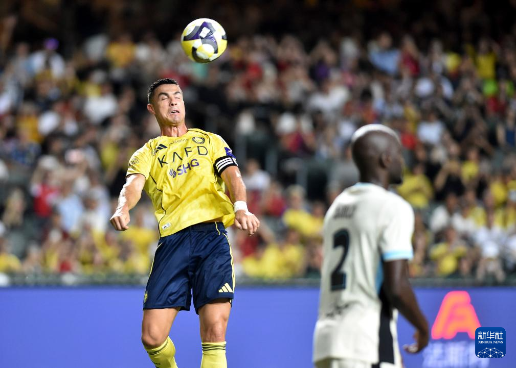 8月19日,利雅得胜利队球员克里斯蒂亚诺·罗纳尔多(左)在比赛中头球攻门。