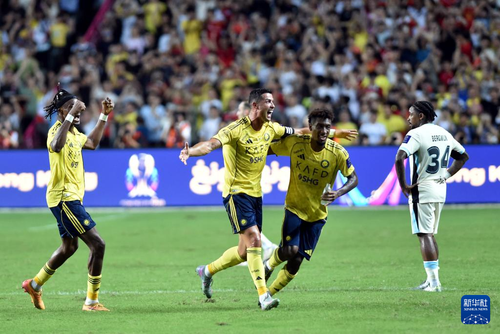 8月19日,利雅得胜利队球员克里斯蒂亚诺·罗纳尔多(左二)与队友庆祝进球。
